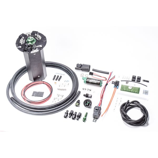This fuel hanger surge tank (FHST) works in conjunction with the OEM in-tank fuel pump module in the Nissan 370Z. The OEM module provides fuel to the surge tank, keeping it full, while the pump(s) in the FHST feed fuel to the engine. It provides a way to upgrade the fuel pump capacity while also eliminating fuel starvation issues. Features an integrated fuel pressure regulator so no additional regulator is needed. Safe to use with E85. The factory fuel pump must be upgraded to a 340LPH pump in order for the system to function properly. This pump supplies fuel to the FHST.