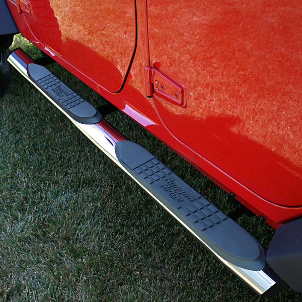 Complete the look with a set of Rugged Ridge tubular tough duty side steps. Available in 3-Inch round, 4-Inch round, and 4.25-Inch oval diameter sizes. The large 4.25-Inch oval and 4-Inch round tubes provide a much cleaner look and are not dwarfed by oversized tires and oversized body style features of the tubing polished to a mirror finish. The polishing process for Rugged Ridge step is longer and deeper pulling out the deepest shine from the steel. A true deep polish! Rugged Ridge painted steel Tube Steps feature special E-coated, .07 inch wall steel that is thick source powder coated for a tough chip resistant finish. The special E-coat undercoating provides double rust protection as it bonds to the metal creating a protective layer found nowhere else. All Rugged Ridge Tube steps feature a truly custom fit with installation brackets constructed of durable 3/17 inch powder coated steel for long life and years of flex-free use. Each Tube Step Features special UV treated no-slip step pads with 5 mounting pins. These step pads are preinstalled on top of the tube, no exposed metal to rust. Side steps carry a 300lb max weight limit.