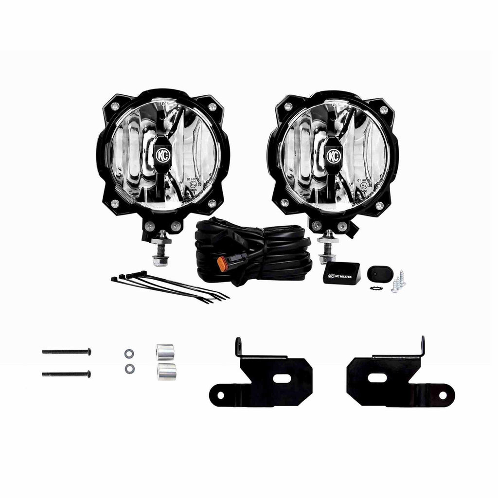 Parts Included: (2) Jeep JL A-Pillar Light Mounts and Hardware, (2) Gravity LED Pro6, (2) KC Pro6 Light Covers, (1) Performance Wiring Harness w/ Waterproof Connectors and LED Light Switch