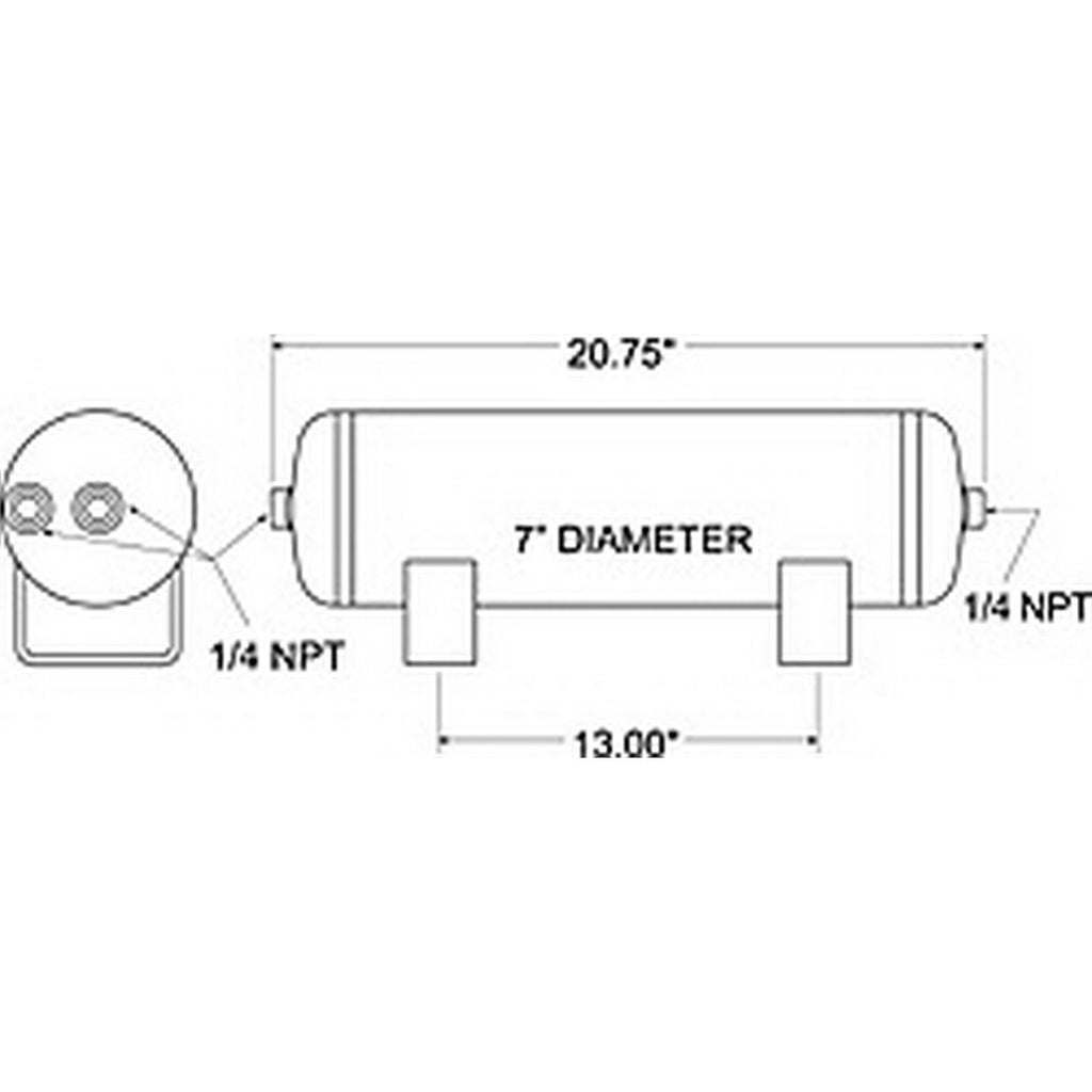 This Firestone air tank provides a source of compressed air for an air spring system. Tank has 3-gallon capacity and (3) 1/4 in. NPT ports. Tank is enamel coated to resist corrosion, tested to be SAE J10 compliant and capable of 150 psi. Features: Provides compressed air source for an air helper spring system Allows for faster inflation of air springs Holds 3 gallons of compressed air Includes 1/4 in. NPT ports (3) Steel tank with brass fittings Resists corrosion with internal and external enamel coating Is SAE J10 compliant Operates at up to 150 psi of maximum pressure Specs: Tank dimensions: 20.75 in. long x 7 in. diameter Tank capacity: 3 gallons Inflation ports: 1/4 in. NPT PSI: Maximum of 150 2-Year limited warranty