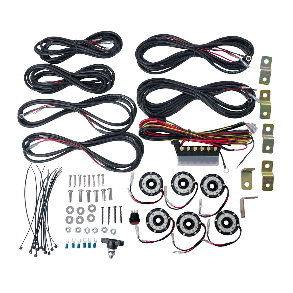 Parts Included: Complete Cyclone LED rock light kit with Cyclone Lights, Premium fuse block with ground post and switch, 6 Deluxe Wiring Harnesses (2 x 16ft, 2 x 11ft, 2 x 8ft), Universal mounts with installation hardware