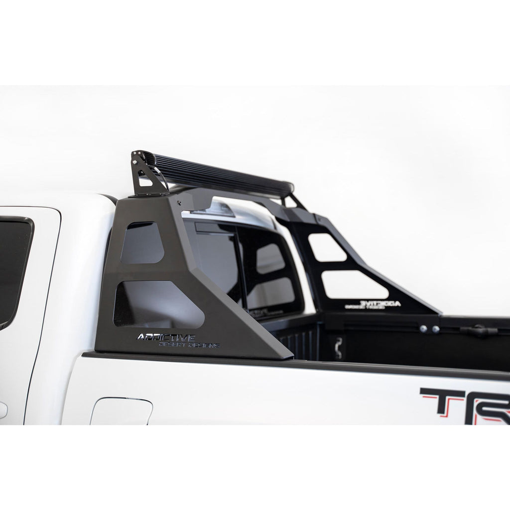 The Stealth Fighter is a lightweight chase rack that gives your Toyota Tacoma a unique style without adding bulk. The fully bolt-on design creates an easy installation with no drilling required. Mounting slots on the upper piece allow you to add extra lighting with a 40" light bar. Third brake light function is fully retained and no bed space is sacrificed. The Stealth Fighter is finished in a hammer black powder coat and made in America.