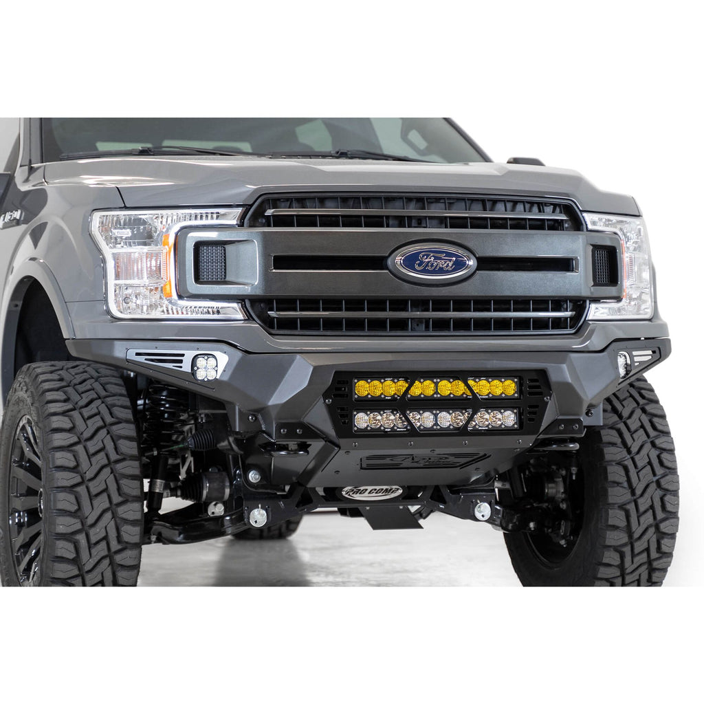 The Addictive Desert Designs Bomber front bumper for the Ford F-150 is the ultimate combination of form and function. The modern plate steel face of the bumper gives an aggressive styling, while the full 3/16" aluminum skid plate allows the Bomber to be lighter than the OEM bumper. The Bomber is offered in three varieties: with 4 Rigid 360 6" light mounts, 3 Baja Designs LP6 light mounts in the center, or two 20" light bar mounts. Additional cube light mounts on each side of the bumper give even more lighting options. OEM tow hooks are retained for added utility. As always, this bumper is fully bolt-on and made in America.