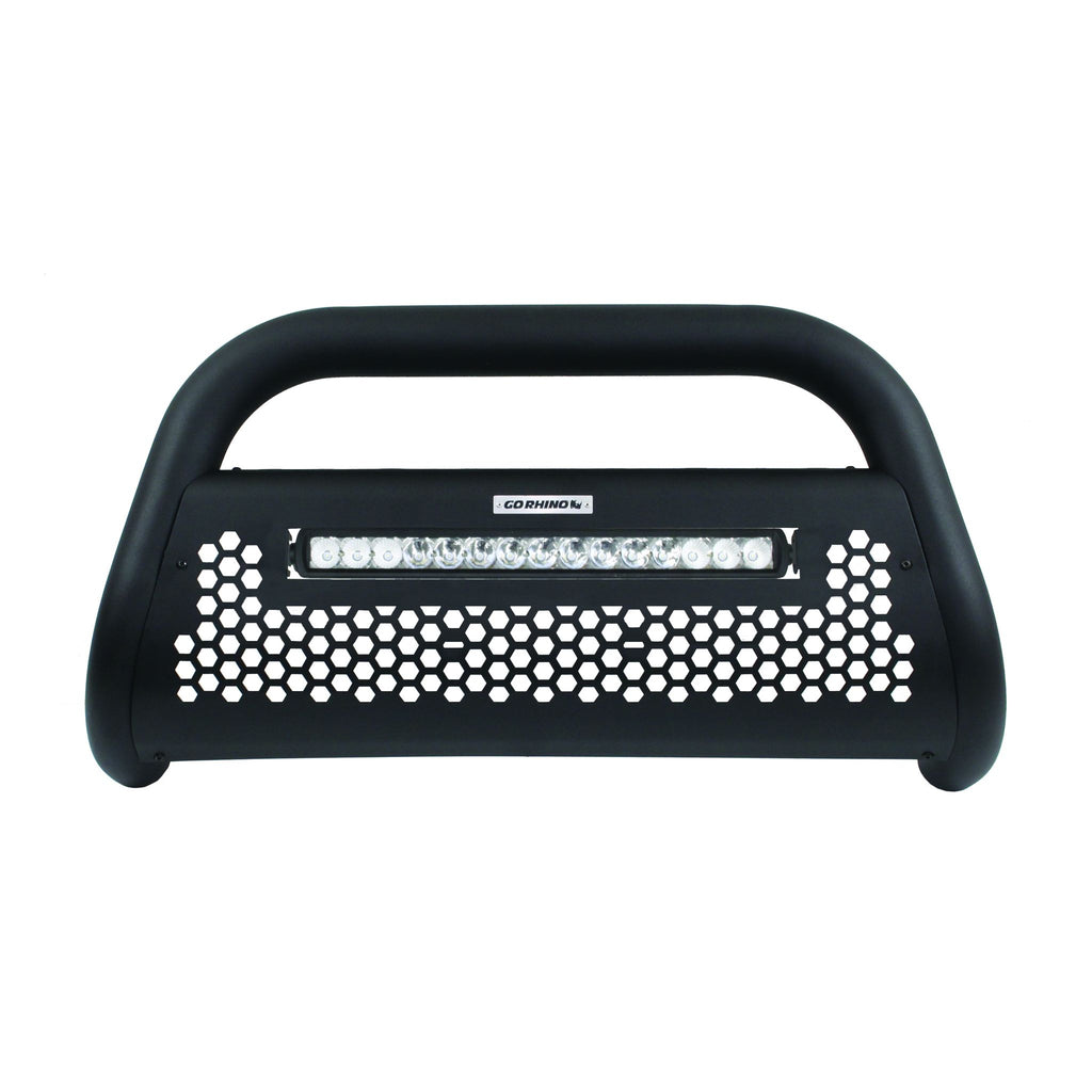Go Rhino RC2 LR Bull Bars offer updated styling and features that combine easy ways to add todays popular LED lights with front-end protection. Our textured black powder coat finish and Go Rhino hex pattern skid platte enhance vehicle styling with integrated openings and easy light mounting.