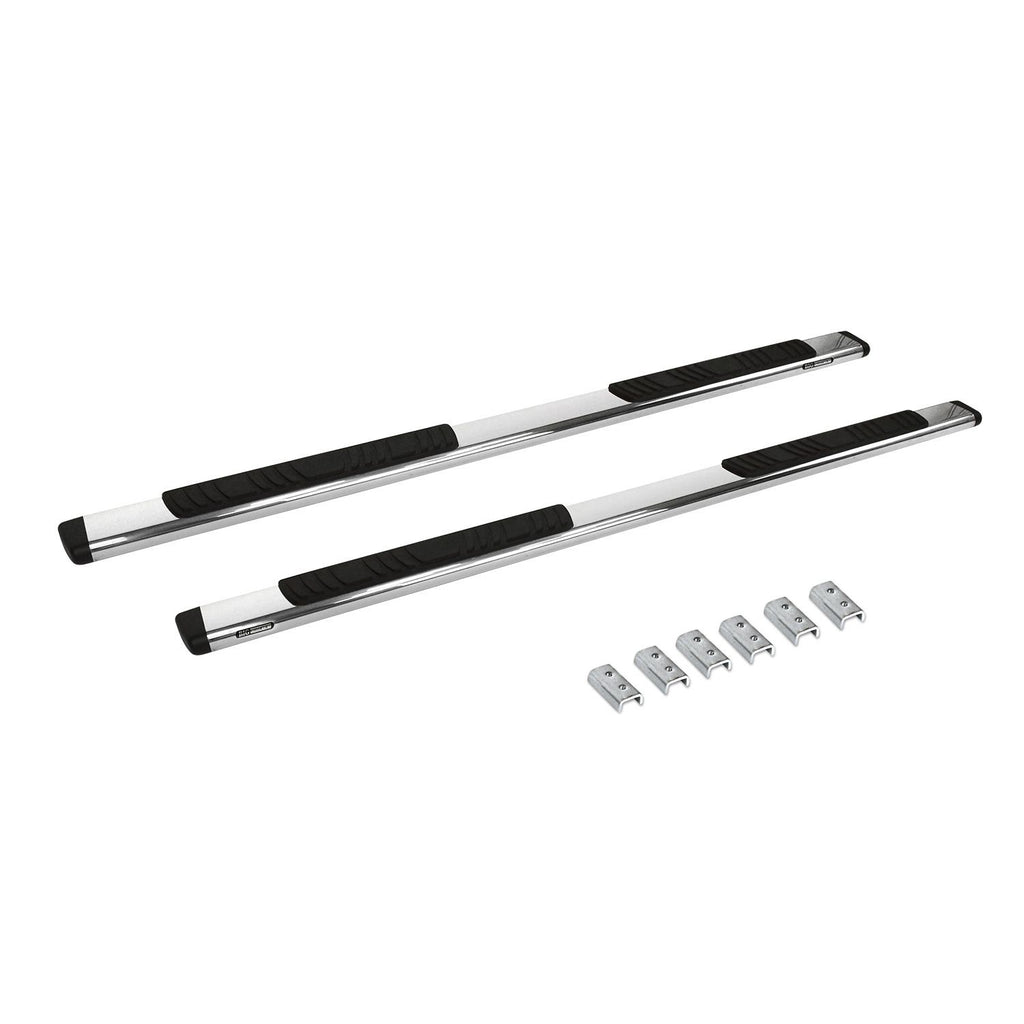 5" OE Xtreme Low Profile SideSteps + Brackets - 80" Long - Polished Stainless Steel - Low profile design, adds functionality and style to your vehicle. Available in lengths for regular, extended and crew cab applications. Also available for most SUV, CUV's. SuperGrip step pads allow easier, safer entry and exit. Bolt-on, no-drill installation for most applications. OEXtreme brackets included. Polished stainless steel with a limited lifetime warranty.