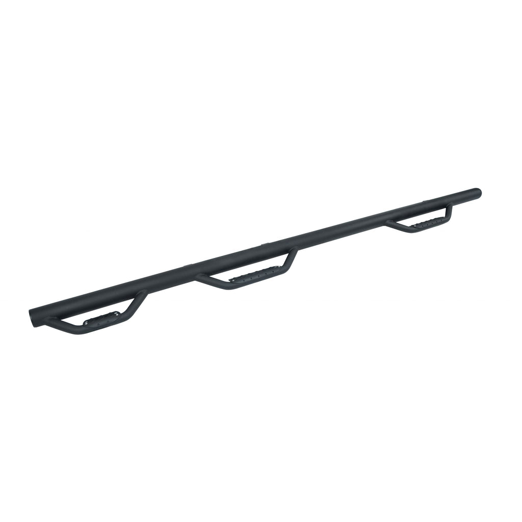 Dominator hoops now feature a wider and more slip resistant step pad. Punched steel step pads offer extra grip. NEW one-piece design. Wheel-to-wheel sidesteps made of 3" round tubing. No drilling required on most applications. Body lift kit compatible. 3rd step allows for easy access to bed of truck. 3 drop down steps with black steel removable step pads. Textured black powder coat with a 5 year warranty.