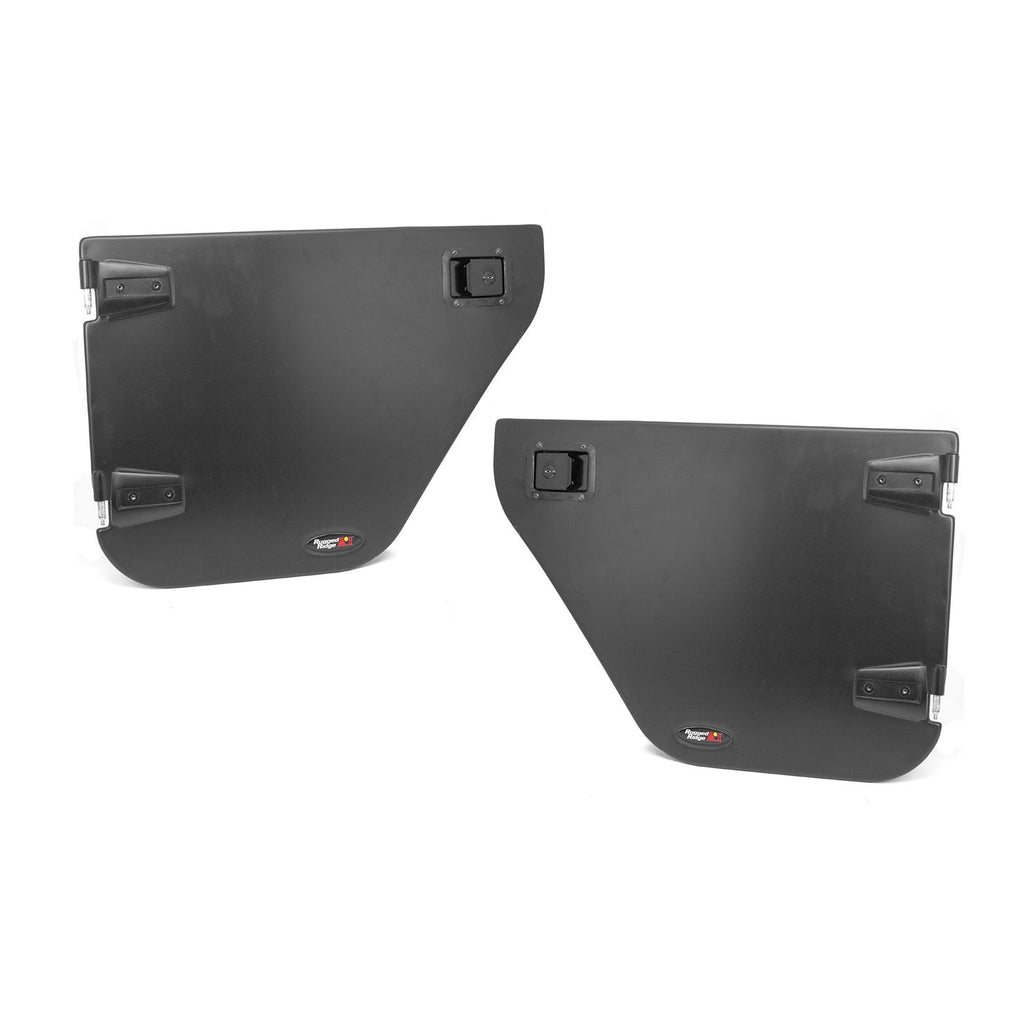 Looking for an economical way to replace your factory full steel doors with a set of half doors? Rugged Ridge Half Doors help keep the elements out while maintaining that open air experience. The Half Doors are constructed from paintable, impact resistant, thermoplastic outer door skins mounted to rigid powder coated internal steel door frames. The Half Doors interchange easily with the factory steel doors and require no body modification for installation. They feature lockable door handles, an internal storage pouch, waterproof seals, OE style hinges, and mirror mounts. The Half Doors are also available with optional upper soft doors. Impact resistant thermoplastic black ABS material with enhanced UV protection. Matte finish is easily paintable for custom match factory look. Specially reinforced internal steel frame provides strength and is powder coated to resist corrosion. The textured inner ABS panels provided a finished look and feature a grab handle and storage pocket. Each door has a weather tight seal to keep out moisture and reduce wind noise. OE Style Hinges provide a factory look and are designed to last. Durable and lockable paddle handle. Matching soft upper doors available for all season protection from the weather. Designed to work with your original mirror or Rugged Ridge replacement mirrors.
