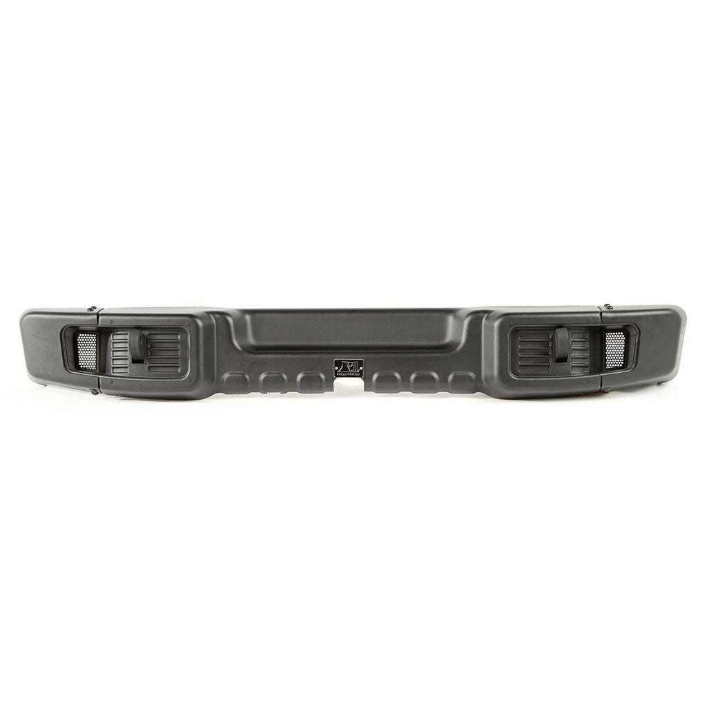 The Stamped Rear Bumper from Rugged Ridge features a tough satin black powder-coated finish with a sturdy 11 gauge stamped steel construction. The stamping process used allows for the most advanced styling on the market, creating a bumper lighter than most aftermarket steel bumpers. Accepts 7/8-inch D-Ring Shackles. Patent No. D803,734
