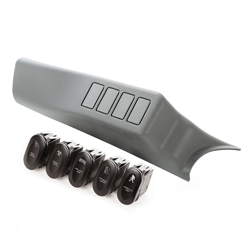 Looking for a handy place to mount your accessory switches that doesn't require cutting or other modifications? This A-Pillar Switch Pod Kit from Outland Automotive has pre-molded cutouts to allow you to mount up to four aftermarket switches, in easy reach, on the driver?s side A-pillar, and out of the way of the shifter handle. Our Pillar Pod has the textured molded finish just like the factory cover it replaces. It snaps into place just like the OE for a great fitment! Each kit includes the driver side A-Pillar Switch Pod and FIVE 2-position Etched Rocker Switches (Zombie Lights, Light Bar Lights, Sasquatch Lights, Rock Lights and Off-Road Lights)